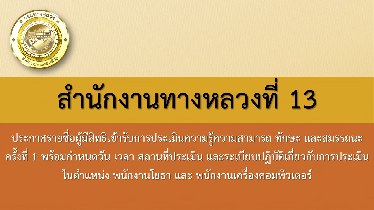 สำนักงานทางหลวงที่ 13 กรมทางหลวง ขอแจ้งประกาศรายชื่อผู้มีสิทธิเข้ารับการประเมินความรู้ความสามารถ ทักษะ และสมรรถนะ ครั้งที่ 1