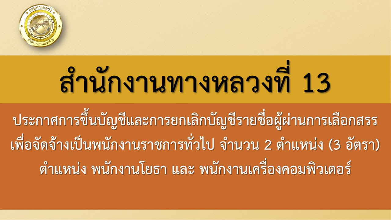 สำนักงานทางหลวงที่ 13 แจ้งประกาศการขึ้นบัญชีและการยกเลิกบัญชีรายชื่อผู้ผ่านการเลือกสรรเพื่อจัดจ้างเป็นพนักงานราชการทั่วไป