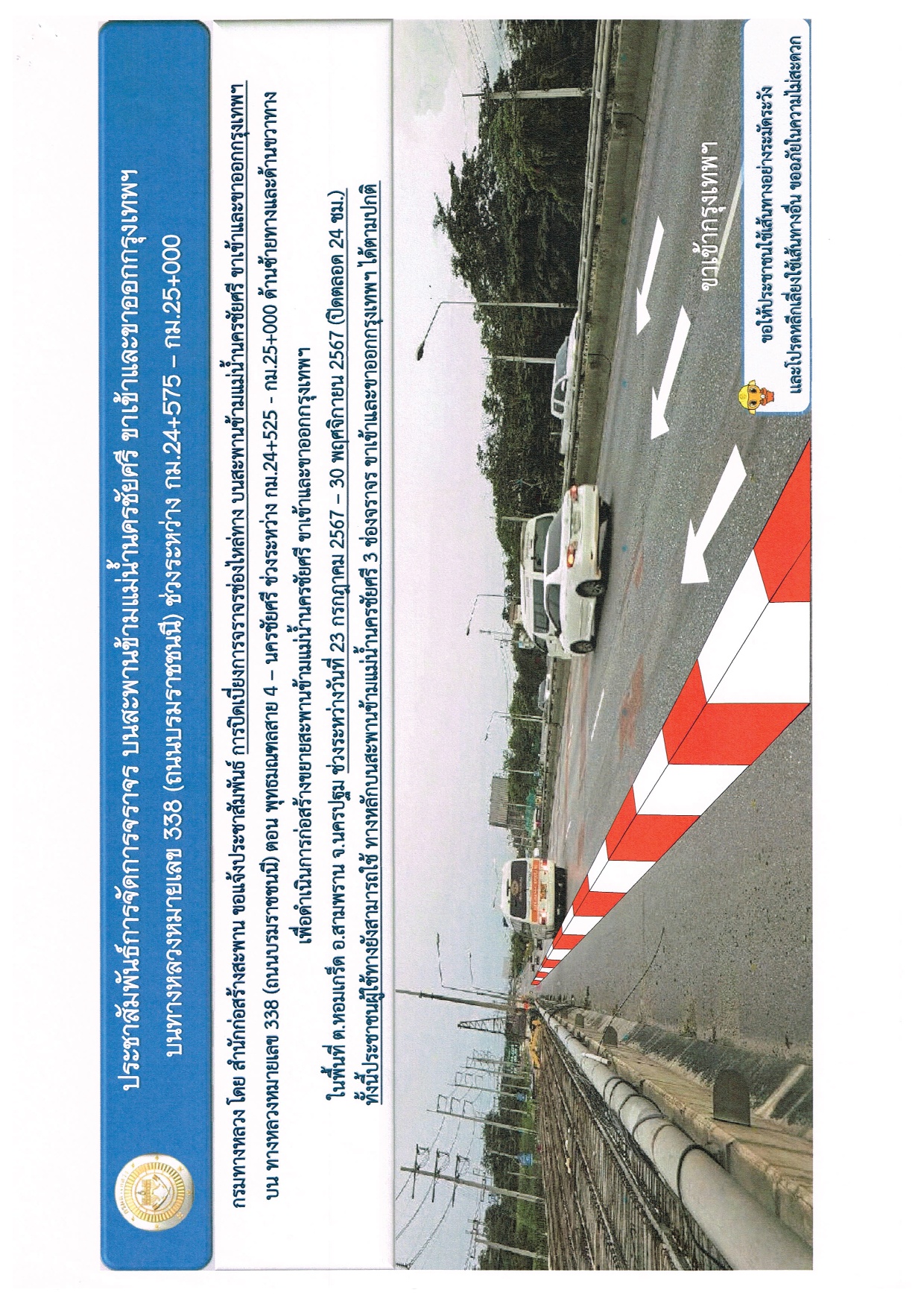 แจ้งประชาสัมพันธ์การจัดการจราจรบนสะพานข้ามแม่น้ำนครชัยศรี ขาเข้าและขาออกกรุงเทพฯ บนถนนทางหลวงหมายเลข 338 (ถนนบรมราชชนนี) ช่วงระหว่าง กม.24+525 - กม.25+000