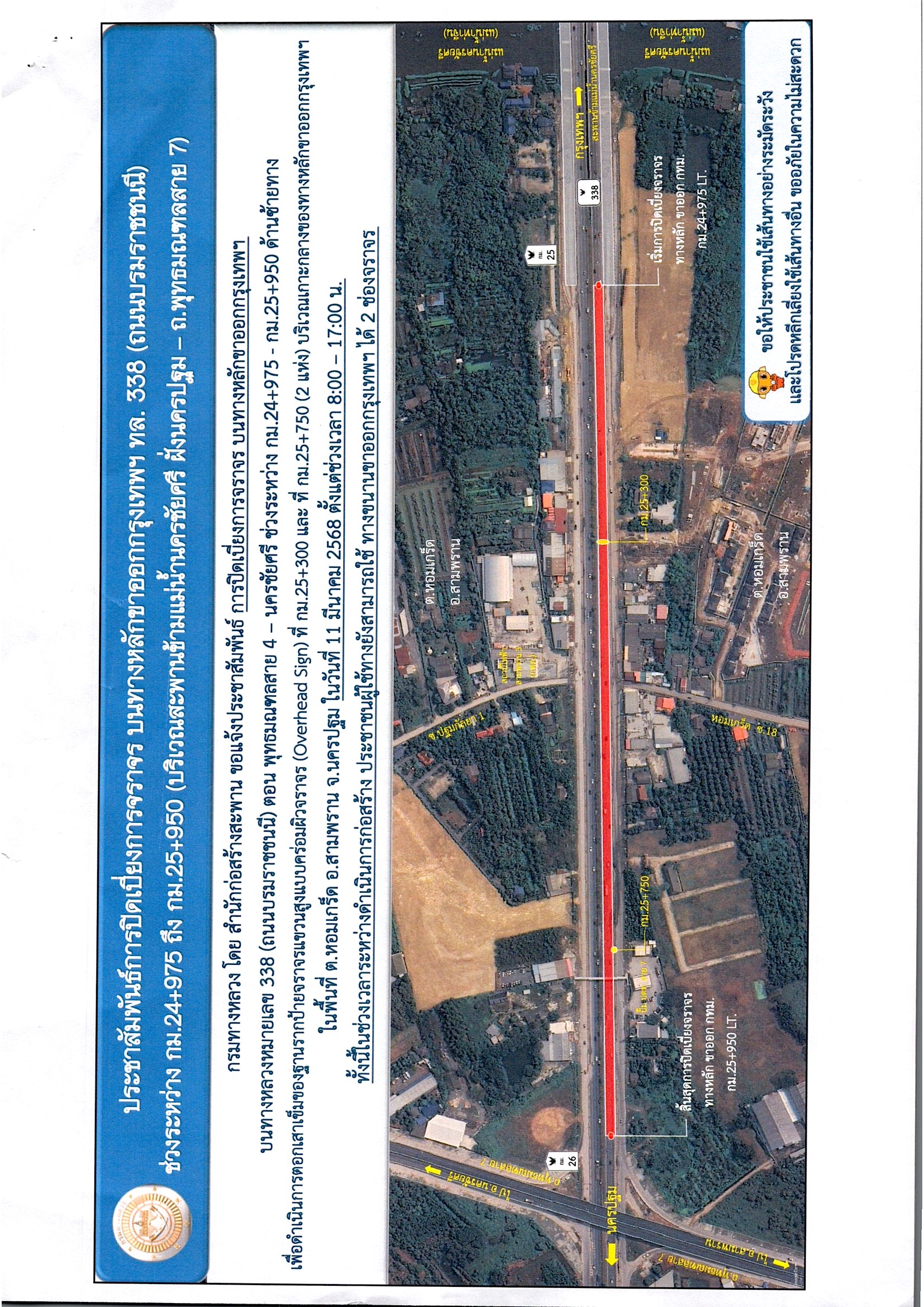 ขอแจ้งประชาสัมพันธ์การปิดเบี่ยงการจราจรบนทางหลักขาออกกรุงเทพ ฯ บริเวณทางหลวงหมายเลข 338 (ถนนบรมราชชนนี) ระหว่าง กม.24+975 ถึง กม.25+950